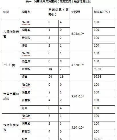 2%NaOH水溶液、湖南五指峰生化有限公司生產的消毒威1:1200倍稀釋、新菌敵1:500倍稀釋、好典1:300倍稀釋的水溶液(現配現用),作用5分鐘對大腸埃希氏菌、多殺性巴氏桿菌、金黃色葡萄球菌、蠟狀桿菌芽孢的殺滅率99.9%以上,其消毒效能符合規(guī)定。